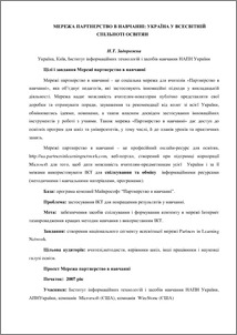 - Задорожна, Н.Т. (2010) Мережа партнерство в навчанні: Україна у всесвітній спільноті освітян In: Матеріали конференції "Програмне забезпечення у сфері освіти і науки" . УкрНЦ РІТ, м. Київ, УкрНЦ РІТ, pp. 31-33.