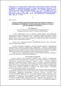 - Ковальчук, О.С. (2012) The seminar-training The Development of Leaders’ Psychological Decision-Making Readiness in Conditions of Organizational Development Актуальні проблеми психології : зб. наукових праць Інституту психології імені Г.С. Костюка НАПН України. – Т. І : Організаційна психологія. Економічна психологія. Соціальна психологія (33). pp. 14-21. ISSN 2072-4772