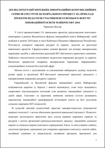 У статті проаналізовані 111 навчальних проектів, представлених вчителями-новаторами в рамках Всесвітнього форуму інноваційної освіти Майкрософт, який відбувся в жовтні 2010 року в місті Кейптаун (Південно-Африканська Республіка). Розглянуто конкретні мережеві ресурси та сервіси, залучені до реалізації навчальних проектів. Сформульовано основні функції, які відіграє використання мережевих засобів у забезпеченні реалізації ІКТ-збагаченого проектного навчання. Здійснено типологізацію утилізованих педагогами мережевих ресурсів та сервісів. Визначено пріоритетні напрямки використання мережевих інформаційно-комунікаційних технологій в освітній сфері.