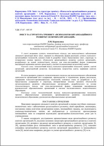 - Карамушка, Л.М. (2011) Content and structure of the training ‘Psychology of organizational development of educational organizations’ Актуальні проблеми психології : зб. наукових праць Інституту психології імені Г.С. Костюка НАПН України. – Т. І : Організаційна психологія. Економічна психологія. Соціальна психологія (31). pp. 3-13. ISSN 2072-4772