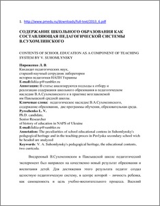 - Пироженко, Лідія Володимирівна (2013) Contents of school education as a component of teaching system by V. Suhomlynsky Проблемы современного образования (6). pp. 48-56. ISSN 2218-8711