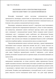 - Ілляшенко, Т.Д. (2012) Inclusive education and perspectives of negotiations of non-achievements at comprehensive secondary school In: Multydystsiplynarnyy approach as a methodological basis for inclusive education . Свідлер А.Л., м. Дніпропетровськ, Україна, pp. 53-62. ISBN 978-617-627-041-6