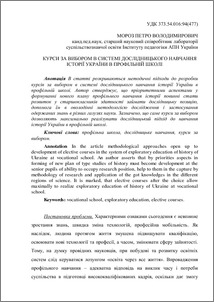 In the article methodological approaches open up to development of elective courses in the system of exploratory education of history of Ukraine at vocational school. An author asserts that by priorities aspects in forming of new plan of type studies of history must become development at the senior pupils of ability to occupy research position, help to them in the capture by methodology of research and application of the got knowledges in the different regions of science. It is marked, that elective courses after the choice allow maximally to realize exploratory education of history of Ukraine at vocational school.