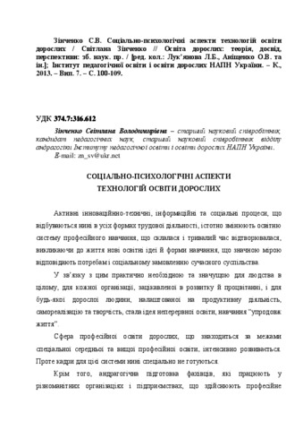 - Зінченко, Світлана Володимирівна (2013) Social and psychological aspects technology adult education Adult education: theory, practice and perspectives (7). pp. 100-109. ISSN 2308-6386
