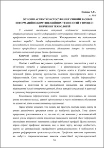 - Попова, Т.С. (2012) Основні аспекти застосування учнями засобів інформаційно-комунікаційних технологій у процесі вивчення технологій In: Актуальні проблеми професійної орієнтації та професійного навчання населення матеріали Міжнародної науково-практичної конференції . ІПК ДСЗУ, м. Київ, Україна, pp. 201-208. ISBN 978-617-649-017-3