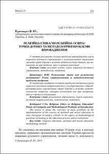 - Кришмарел, В. Ю. (2012) Religious Ethics or Religious Education? Points of Contiguity and Methodological Problems of Introduction Наукові записки. Серія "Психологія і педагогіка", 21 (21). pp. 231-239. ISSN 966-7631-15-Х