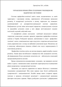 The article deals with the main aspects of management of vocational schools as an open system that develops and organizes itself. Office open system of vocational education defined as the interaction possibilities of decentralized samorehulyatsiynyh branch of government from outside government regulation, which limited monitoring and evaluation of the VET system to achieve the desired result.