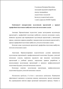 - Годлевська, К.В. (2013) Features of multimedia presentations in the training of future primary school teachers Scientific Notes Vinnitsa State Pedagogical University named after Mikhail Kotsyubinskogo (40). pp. 182-186.