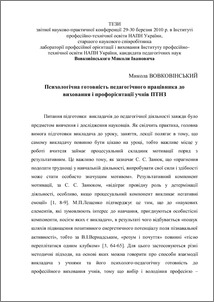 - Вовковінський, М.І. (2010) Психологічна готовність педагогічного працівника до виховання і профорієнтації учнів ПТНЗ In: Науково-методичне забезпечення професійної освіти і навчання (1). Інститут професійно-технічної освіти НАПН України, м.Київ, Україна, pp. 45-47.