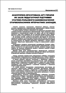 Cтаттю присвячено можливостям педагогічної підтримки статево-рольового самовизначення старшокласників загальноосвітніх закладів інтернатного типу засобами аналітично-орієнтованої арт-терапії. В статті розкрито сутність позитивного та негативного розв'язання кризи статево-рольового самовизначення старшокласників. Також розглянуто ґенеза формування у старшокласників уявлень про самого себе та своє майбутнє, включаючи плани щодо створення сім’ї та виконання ґендерних ролей, відображення цих уявлень у творчих візуальних та письмових роботах старшокласників. За висновком автора, аналітично-орієнтована арт-терапія як технологія педагогічної підтримки виступає дієвим засобом розвитку стійкого творчого та цілісного Я. Особлива увага приділяється мовній інтерпретації візуальних образів як смислотворення та рефлексії суб’єктивних переживань в процесі творчої діяльності, обґрунтовано ефективність її впливу на самовизначення старшокласників.