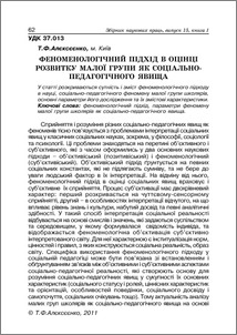 - Алєксєєнко, Т.Ф. (2011) Феноменологічний підхід в оцінці розвитку малої групи як соціально-педагогічного явища Теоретико-методичні проблеми виховання дітей та учнівської молоді, 1 (15). pp. 62-69. ISSN 978-617-620-015-4