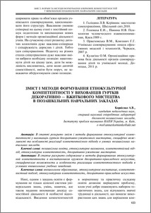 В статті розкрито зміст і методи формування етнокультурної компетентності у вихованців гуртків декоративно-ужиткового мистецтва, специфічні можливості та особливості реалізації компетентнісного підходу в умовах позашкільних навчальних закладів.