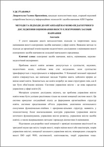 - Лаврентьєва, Г.П. (2009) Approaches and methods of organization of scientific pedagogical investigation on quality of electronic Інформаційні технології і засоби навчання, 2 (10). ISSN 2076-8184