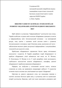 - Годлевська, К.В. (2012) Multimedia technologies for the development of gifted children of primary school age Modern information technologies and innovative teaching methods in training: methodology, theory, experience, problems (31). pp. 87-90.