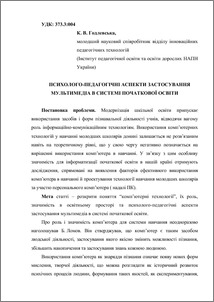 - Годлевська, К.В. (2012) Psychological and pedagogical aspects of using multimedia in the system of primary education Collected Works of Berdyansk State Pedagogical University (Teaching Science) (1). pp. 55-60.