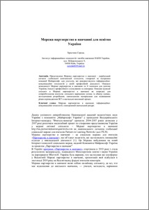 - Середа, Х.В. (orcid.org/0000-0002-4510-7173) (2011) Partners in Learning Network for the teachers of Ukraine Інформаційні технології в освіті, 9. pp. 69-80. ISSN 2306-1707