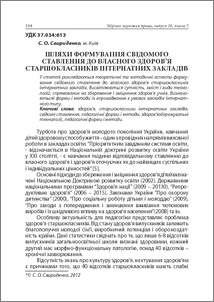 - Свириденко, С.О. (2012) Шляхи формування свідомогоставлення до власного здоров’я старшокласників інтернатних закладів Теоретико-методичні проблеми виховання дітей та учнівської молоді, 3 (16). pp. 164-172. ISSN 978-966-7406-72-1
