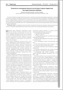 В статье автор анализирует представленные в современной научной литературе и нормативно-правовых документах понятия полихудожественный подход, полихудожественное воспитание, воспитательная технология. Обосновывает необходимость использования личностно-ориентированных технологий в воспитании. Определяет структурные составляющие воспитательной технологии. На основе проведённого анализа предлагает собственную личностно-ориентированную технологию полихудожественного воспитания старших подростков.