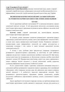 - Лаврентьєва, Г.П. (2007) Influence of computer-oriented means of education on the development of eye-mindedness thinking of senior preschool age children Інформаційні технології і засоби навчання, 1 (2). ISSN 2076-8184