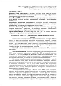 - Богачков, Ю.М., Биков, В.Ю., Красношапка, В.О., Кухаренко, В.М. and Пасіхов, Ю.Я. (2009) Project concept “Distance learning of pupils" Інформаційні технології і засоби навчання, 5 (13). ISSN 2076-8184