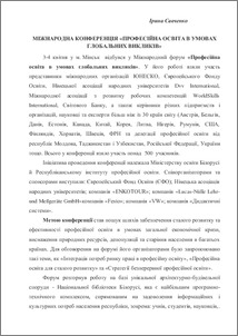 Статтю присвячено проведеному в Республіці Білорусь Міжнародному форуму «Професійна освіта в умовах глобальних викликів», в якому взяли участь представники ЮНЕСКО, Європейського Фонду Освіти, Німецької асоціації народних університетів Dvv International, Міжнародної асоціації з розвитку робочих компетенцій World Skills International, Світового Банку, а також керівники різних підприємств і організацій, науковці та експерти більш ніж із 30 країн світу (Австрія, Бельгія, Данія, Естонія, Канада, Китай, Корея, Литва, Нігерія, Румунія, США, Фінляндія, Хорватія, Швеція, ФРН та делегації професійної освіти від республік Молдова, Таджикистан і Узбекистан, Російської Федерації, України тощо, всього понад 500 учасників.