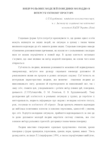 - Коробанова, О.Л. (orcid.org/0000-0003-3539-871X) (2015) The choice of behavior role models in intersubject space Особистість у сучасному світі. ІІІ Всеукраїнський психологічний конгрес з міжнародною участю (2). pp. 171-175.