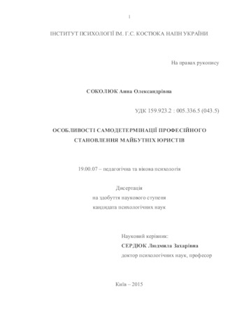 - Соколюк, А.О. (2015) Features of self-determination of the professional becoming of future lawyers Dissertation candidate thesis, Інститут психології імені Г.С.Костюка.