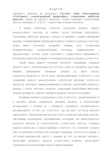 The dissertation presents a theoretical foundation and experiential research of psychological factors of professional self-identity formation, which is the basis for achieving high results it educational and professional activities and further professional success. Found that professional development is determined by system of meaning and motivational personality formations, that determine the polyvalent focus on individual assessment and mastering her future professional activities. Determined the structural components of the phenomenon of self-professional development of personality, that are also the levels of its organization, goals, values, meanings, awareness of the career; the prospect of a professional future, professional motivation, professional identity of a professional future; self-motivation and self-realization; self-efficiency of personality, personal autonomy, understanding their potential and faith in their capabilities; the ability of conscious control and assessment of their own achievements and possibilities. Developed and tested the program of psychological self-promoting of professional development of future specialists during the studying at the university. The results of testing a program have shown its high efficiency. Implementation of the program has contributed the activation of needs of the individual self-knowledge, the formation of personal reflection; forming and maintaining the positive self-attitude; the formation of self-motivation as a basis of self-actualization; activation of mechanisms of reconsideration of itself as the subject of interaction with the outside and other people; actualization and self-awareness goals, needs in functional autonomy and self-efficiency of personality, the formation of skills of self-efficacy and self-knowledge. The empirical results confirmed the hypothesis of the research.