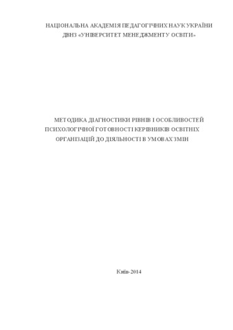 In the scientific-industrial production is presented method of diagnostic of peculiarities and levels of psychological readiness of heads of educational organizations to work in terms of changes as a result of their psychological training , which is developed and tested in the execution of research "Psychological preparation Heads of educational institutions to work in terms of change "(State registration number 0112U000700). Appointed for heads of educational organizations; science teachers employees of Postgraduate Education, engaged monitoring the quality of psychological training of educators; psychologists who work in education; scientists who study the psychological problems improve management and Postgraduate Education; all those who are interested in self-knowledge and self-development.