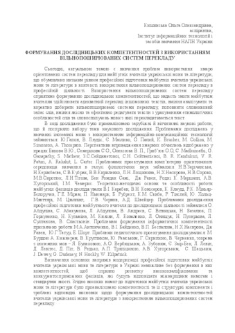 - Кишинська, О.О. (2015) The formation of investigations competences with using free-oriented systems of translation In: III Всеукраїнська науково-практична конференція молодих учених "Наукова молодь-2015" . ІІТЗН, м.Київ, Україна. (In Press)