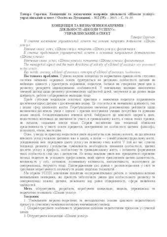 - Сорочан, Т.М. (2013) The concept and definition of the activities of the "School of Success": administrative aspect Освіта на Луганщині, 2 (39). pp. 31-35.