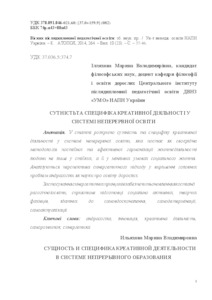 - Ілляхова, М.В. (2014) The essence and specificity of creative activity in the system of lifelong learning Вісник післядипломної педагогічної освіти, 10 (23). pp. 37-46.