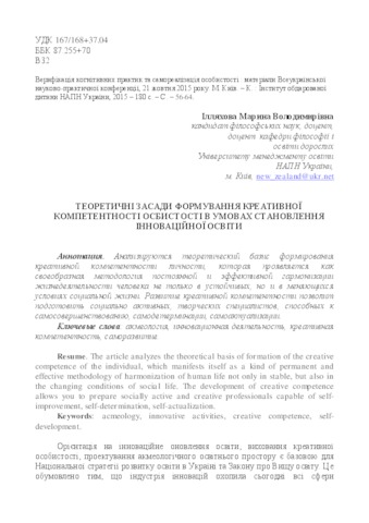 - Ілляхова, М.В. (2015) The theoretical basis of formation of creative personality competence in conditions of innovative education Верифікація когнітивних практик та самореалізація особистості: матеріали Всеукраїнської науково-практичної конференції, 21 жовтня 2015 року, м. Київ. pp. 56-64.