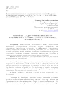 The article analyzes the theoretical basis of formation of the creative competence of the individual, which manifests itself as a kind of permanent and effective methodology of harmonization of human life not only in stable, but also in the changing conditions of social life. The development of creative competence allows you to prepare socially active and creative professionals capable of self-improvement, self-determination, self-actualization.