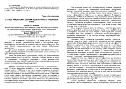 - Русалкіна, Любов Миколаївна and Косянчук, Сергій Володимирович (2009) Resources of rhetoric as a basis for personal growth of students Українська мова і література в школі, 8 (78). pp. 28-31.