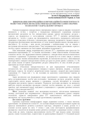 - Попель, М.В. (2015) Measuring Information and Communication competence of mathematics teachers on the use of cloud technologies in educational process In: ІІІ Всеукраїнська науково-практична конференція молодих учених «Наукова молодь-2015» . ІІТЗН НАПН України, м.Київ, Україна. (Submitted)