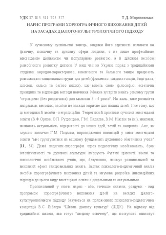 - Морозовська, Тетяна Дмитрівна (2012) Рrogram of choreographic education based on the dialogo-culturologic approach Психологія діалогу та світ людини (2). pp. 178-189.