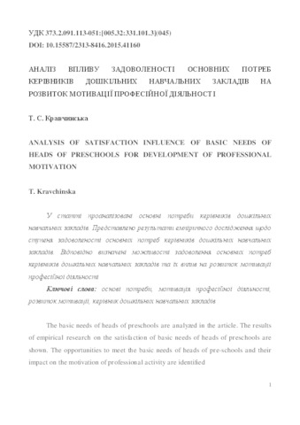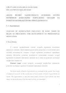 - Кравчинська, Т.С. (2015) Аnalysis of satisfaction influence of basic needs of heads of preschools for development of professional motivation «ScienceRise», 5(9) (4). pp. 69-73. ISSN 2313-6286