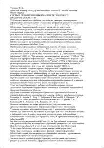 - Ткаченко, В.А. (2011) The system improving information literacy librarians In: Звітна наукова конференція Інституту інформаційних технологій і засобів навчання АПН України . Інституту інформаційних технологій і засобів навчання АПН України, м.Київ, України, pp. 69-71. ISBN 2076-8184
