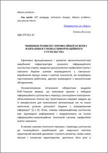 - Волкова, Т.В. (2011) Factors of development of Vocational Education and Training in Information Society Модернізація професійної освіти і навчання: проблеми, пошуки і перспективи (1). pp. 32-41. ISSN ISBN 978-966-2553-03-1