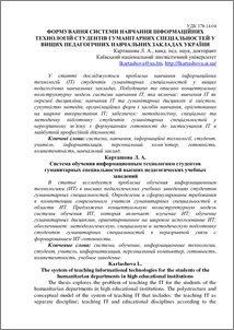 The thesis explores the problem of teaching the IT for the students of the humanitarian departments in high educational institutions. The polystructure and conceptual model of the system of teaching IT that includes: the teaching IT as separate discipline; teaching IT and educational disciplines according to the context, the complex of methods, organizational forms and means of teaching that are focused on the widespread use of IT; that provides: methodological, professional and method training of future teachers in inseparable connection with the formation of readiness to use IT in future career are being constructed and described.