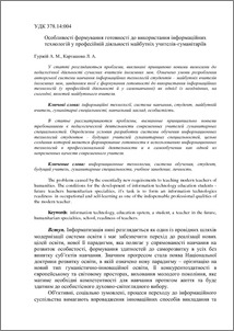 The problems caused by the essentially new requirements to teaching modern teachers of humanities. The conditions for the development of information technology education students - future teachers humanitarian specialties, it's task is to form an information technologies readiness in occupational and self-learning as one of the indispensable professional qualities of the modern teacher.