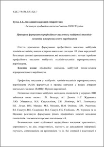 - Зуєва, Альона Борисівна (2014) Principles of professional thinking of future technicical mechanics of agrarian sector Матеріали Х всеукраїнської наково-методичної конференції "Проблеми підготовки фахівців-аграріїв в навчальних закладах вищої та професійної освіти" (1).