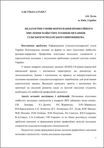 - Зуєва, Альона Борисівна (2013) Педагогічні умови формування професійного мислення майбутніх техніків-механіків сільськогосподарського виробництва Сучасні інформаційні технології та інноваційні методики навчання у підготовці фахівців: методологія, теорія досвід, проблеми, 1 (34). pp. 159-163. ISSN 978-966-2337-01-3