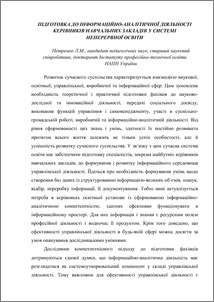 - Петренко, Лариса Михайлівна (2011) Підготовка до інформаційно-аналітичної діяльності керівників навчальних закладів у системі неперервної освіти In: Сучасні проблеми підготовки фахівців до соціальної та культурної діяльності: матеріали Всеукраїнської науково-практичної конференції . КІСКЗ, м.Київ, Україна, pp. 251-253.