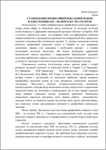 - Грищенко, Ю.В. (2009) Становлення професійної вокальної освіти в Одесі в кінці ХІХ – на початку ХХ століття Педагогіка і психологія. Науковий вісник Чернівецького університету (468). pp. 123-129.