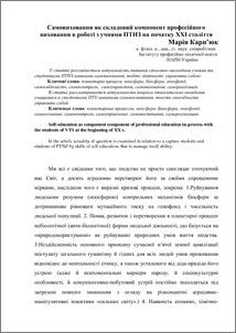 - Карп'юк, М.Д. (2010) Self-education as component component of professional education in-process with the students of VTS at the beginning of XX s. In: Науково-методичне забезпечення професійної освіти і навчання (1). Інститут професійно-технічної освіти НАПН України, м.Київ, Україна, pp. 77-85.