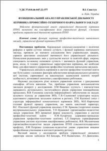 Здійснено функціональний аналіз управлінської діяльності керівника ПТНЗ, визначено та класифіковано його управлінські функції, з’ясовано проблеми управлінської діяльності керівників ПТНЗ.