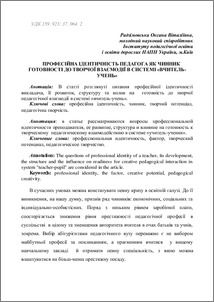 - Радзімовська, О. В. (2012) The professional identity of the teacher as a factor in readiness for creative interaction in the "teacher-student" Psychological and pedagogical problems of teaching actions, 1 (1). pp. 337-347. ISSN 978-067-05-0017-5