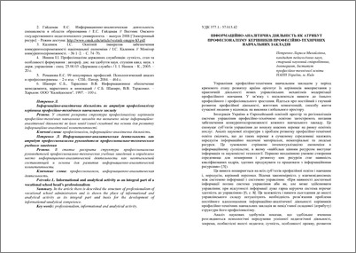 - Петренко, Лариса Михайлівна (2011) Informational and analytical activity as an integral part of a vocational school head’s professionalism In: Професіоналізм педагога в контексті європейського вибору України: якість освіти – основа конкурентоспроможності майбутнього фахівця: Матеріали міжнародної науково-практичної конференції . РВНЗ "Кримський гуманітарний університет", Ялта, pp. 123-126.